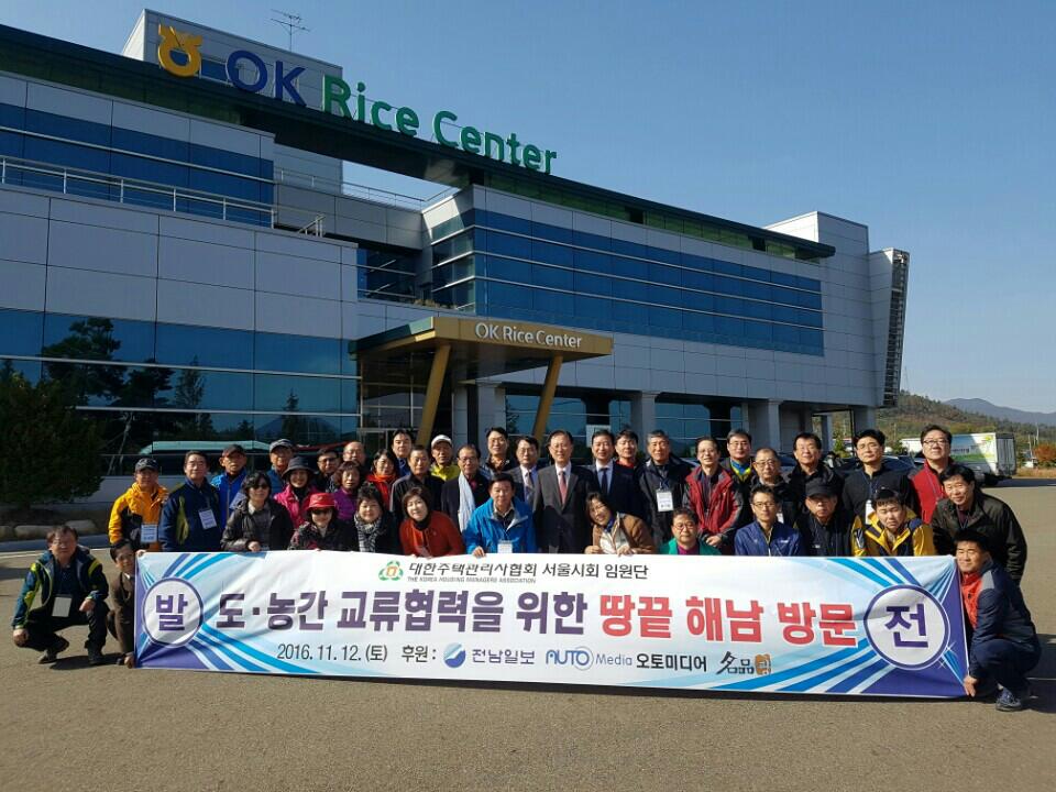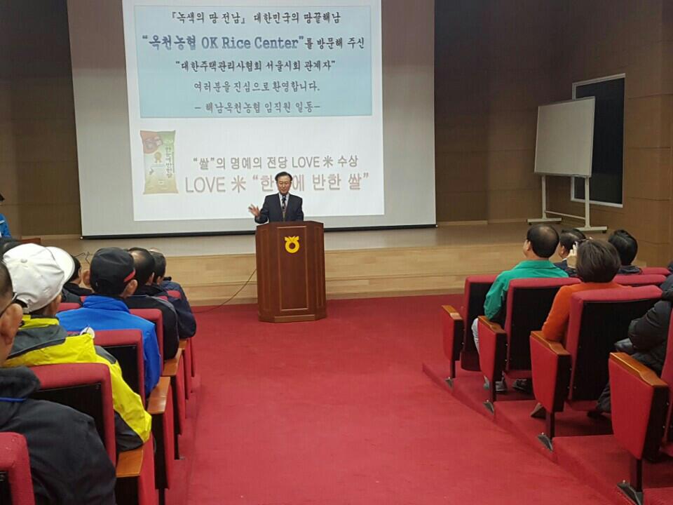 2016.11.12일 오토미디어 남진 대표와 이상철 본부장은 주택관리사서울시회 지부장 40여명과 명품팜 참여 업체인 전남 해남의 옥천 OK rice 센터(한눈에 맑은 쌀)와 화원 농협 김치 가공공장(이맑은 배추)등 업체를 탐방하였습니다. 이날 행사에는 옥천농협 윤흥현 상임 이사님과 전남일보 양동원 상무님께서도 참석해주셨습니다.